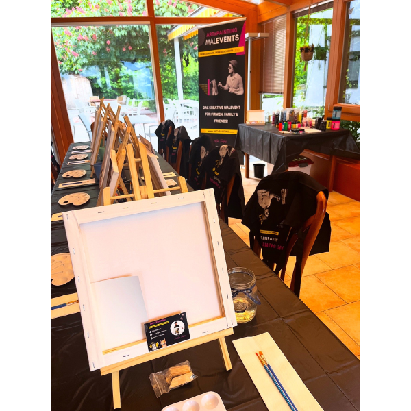 Im Preis inbegriffen ist ein hochwertiges Kreativ-Set-up mit Farben, Pinseln, Schürze, Staffelei sowie einer Leinwand auf Keilrahmen – du kannst direkt loslegen und das Event genießen.